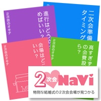 結婚式には欠かせない2次会。 幹事を頼まれたけど会場選びや進行などがわからない・・ 2次会ナビはそんなあなたにぴったりな2次会専門情報サイトです! 会場選びはもちろん、当日までの進行方向やご予算、 さらに2次会のプロによるサポートまで充実した情報が盛りだくさん!